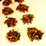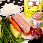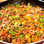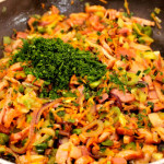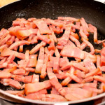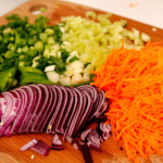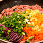 - Intre timp se pune baconul taita fasii cat mai mici la calit, in putin ulei apoi se adauga legumele tocate astfel (ceapa rosie julien, ardeiul iute rondele, ardeiul kapia cubulete, ceapa verde rondele si morcovul dat pe razatoarea mica.