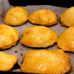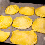 - Se pun in tava pe hartie de copt, iar pe margine unde se imbina foaia de sus cu cea de jos se preseaza cu varful unei furculite astfel incant in momentul coacerii sa nu iasa aluatul din ele.
