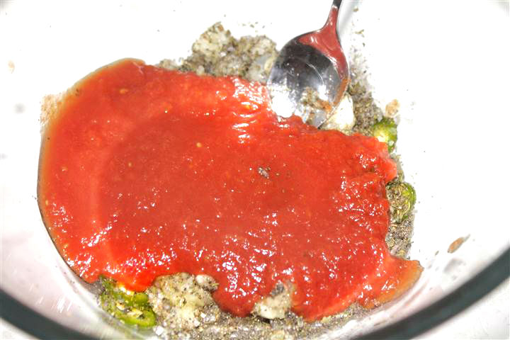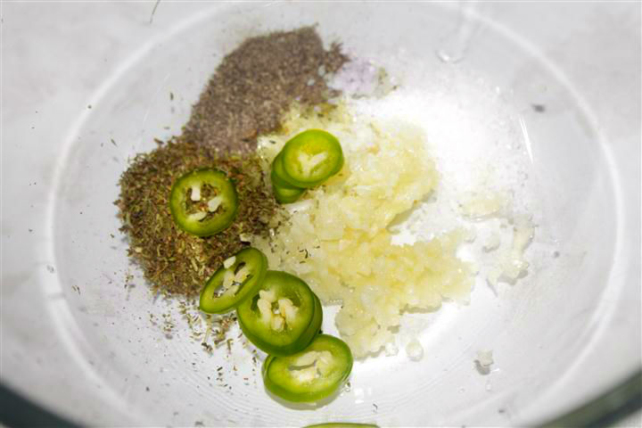 Intre timp se prepara sosul pentru friptura de porc la tava. Intr-un bol amestecati usturoiul pisat, cimbrul, sarea, piperul, foile de dafin si ardeiul iute.