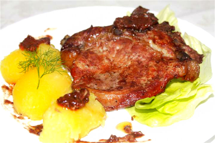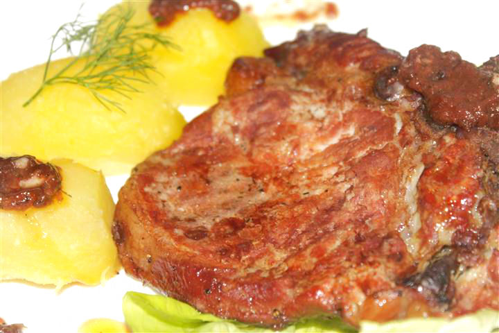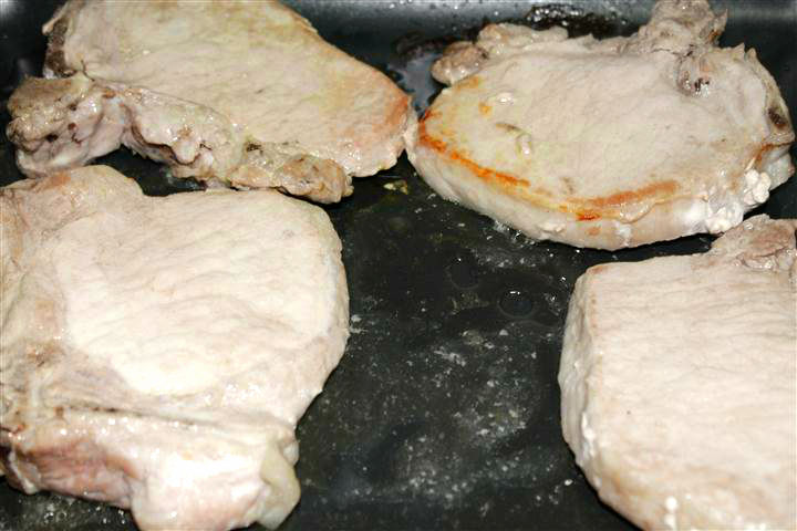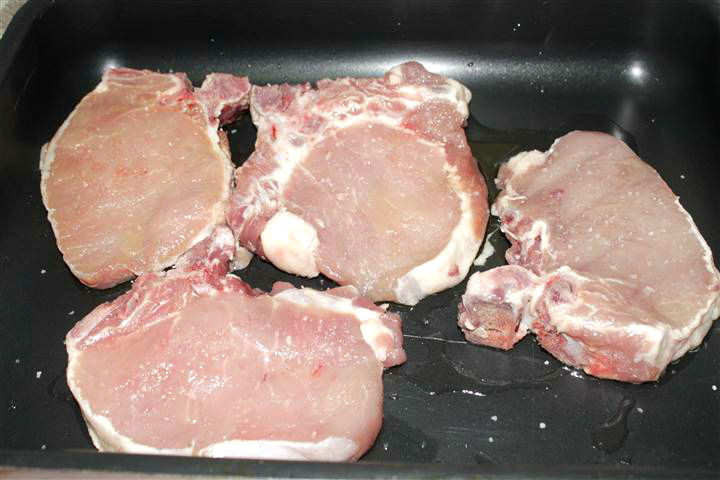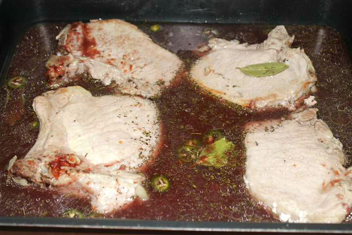 Carnea de porc se taie in bucati groase de 1 deget (1,5 cm). Intr-o tava stropita cu ulei se pun bucatile de porc si se da la cuptorul incalzit la 200 de grade pana prind o culoare aurier e o parte.
