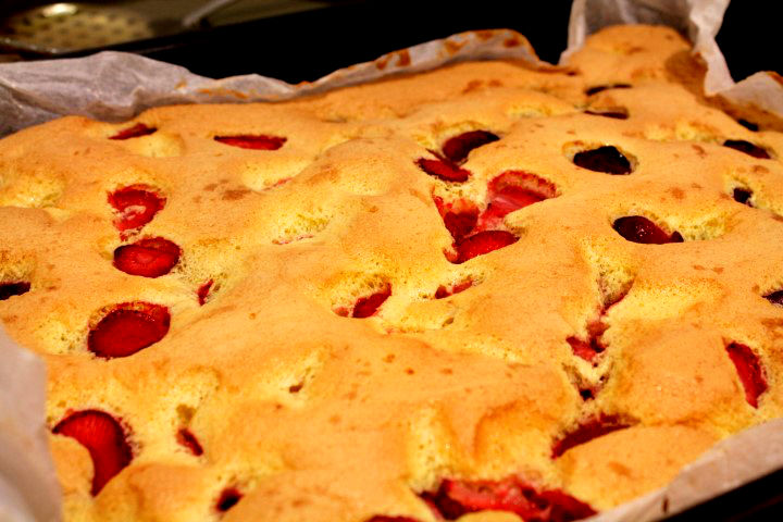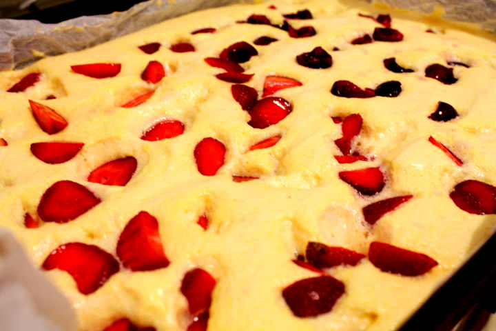 Se da la cuptoru incalzit la 180 de grade pentru 7-10 minute apoi se adauga capsunile. Capsunile se spala bine si se taie in doua, apoi se presara peste aluatul de prajitura.