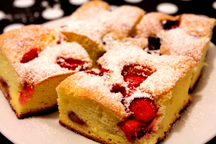 Can faceti prajituri cu pandispan si vreti sa puneti fructe in acesta trebuie sa stiti un mic secret. Dupa ce turnati aluatul in tava, dati tava la cuptorul incalzit pentru 7-8 minute, apoi scoateti si puneti fructele. Daca puneti fructele de la inceput acestea se vor scufunda in aluat, vor ajunge pe fundul tavii si se vor arde. Puteti sa faceti combinatii de fructe asa cum am facut si eu (cirese si capsuni) sau orice fruct va da prin cap, kiwi, banane, visine, prune, caise sau piersici etc.
