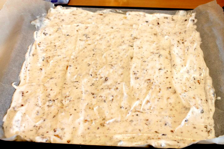 Intr-o tava puneti hartie de copt turnati blatul si intindeti uniform.