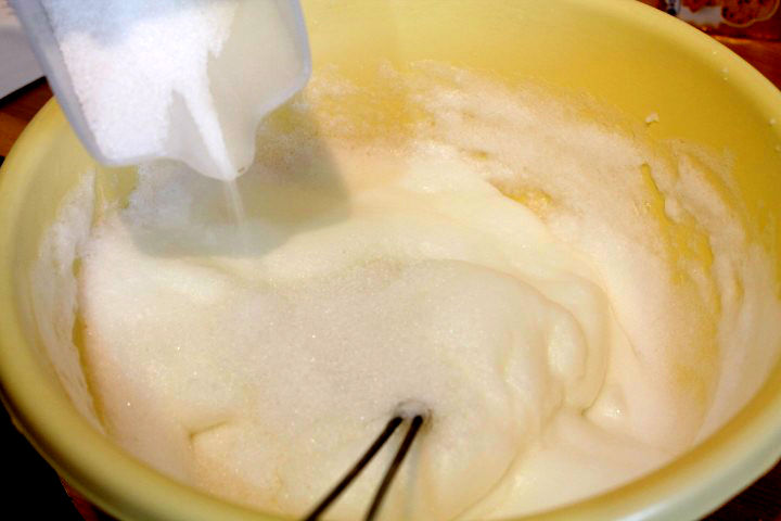 Se separa albusurile de galbenusuri, galbenusurile nu se arunca o sa aveti nevoie de ele la crema.ย Albusurile se bat spuma tare, dupa ce s-au intarit se adauga zaharul.
