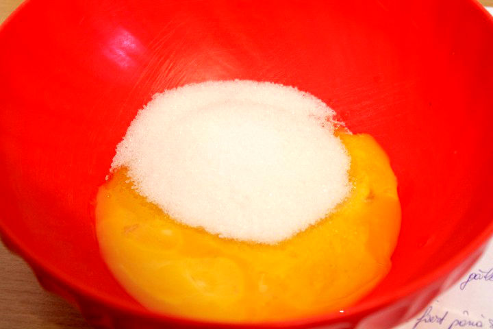 Frecati galbesurile cu 5 linguri de zahar pana obineti o crema de consistenta smantanei.