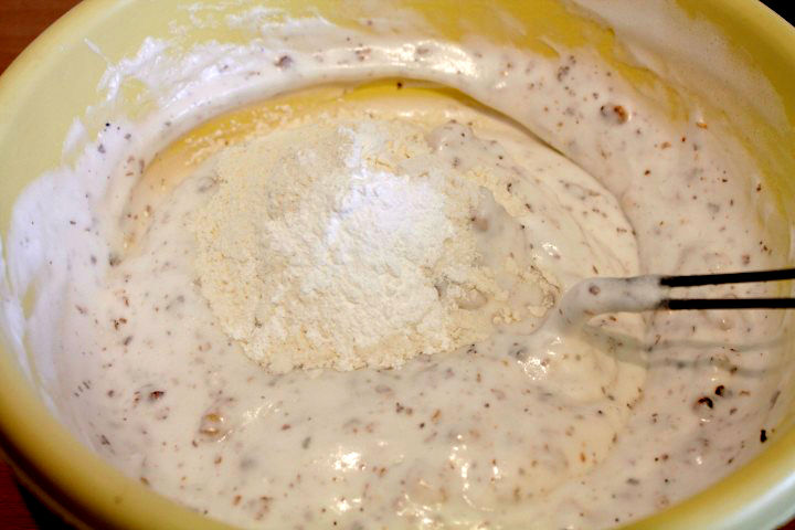Adaugati si 200 de g de nuci coapte, tocate cu cutitul sau rupte cu degetele.ย Amestecati usor sa se incorporeze si nucile apoi adaugati si faina cu praful de copt si amestecati sa se incoporeze si aceastea.
