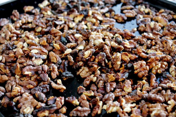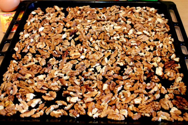 Nucile se pun in tava si se baga la cuptorul incins la 180 de grade pentru 5-7 minute, la vreo 3-4 minute mai intoarceti-le. Daca se arad putin frecati-le in palma sa se ia arusara de pe ele.