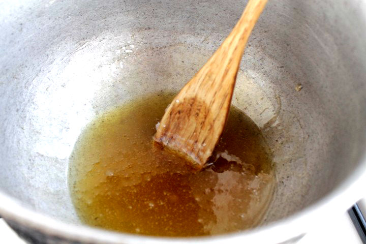 Intr-un tuciulet (oala) puneti la topit 5 linguri de zahar.