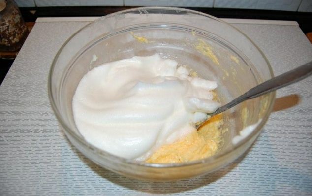 II. Albusurile se separa de galbenusuri si se bat spuma. Albusuruile batute spuma se incoporeaza impreuna cu aluatul de zahar si unt si se amesteca usor pana devine mai vascos (rigid)