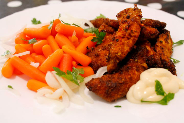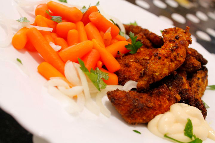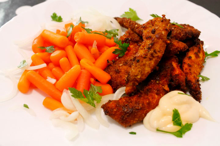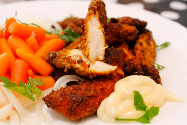 Curry-ul este un condiment pe care il indragesc foarte mult si il utilizez ori de cate ori am ocazia. Merge folosit la orez, linte, cartofi, ciuperci, creveti, peste, porc, pui si multe altele. In reteta de astazi o sa va prezint o reteta simpla de pui cu curry, un aperitiv desobit as putea spune chiar daca eu l-am servit si prezentat ca pe o mancare principala. Daca atunci cand taiati feliutele de pui le faceti mai subtirele, rezultatul va fi si mai crocant fiind ideal petreceri si merge bine cu bere ;).