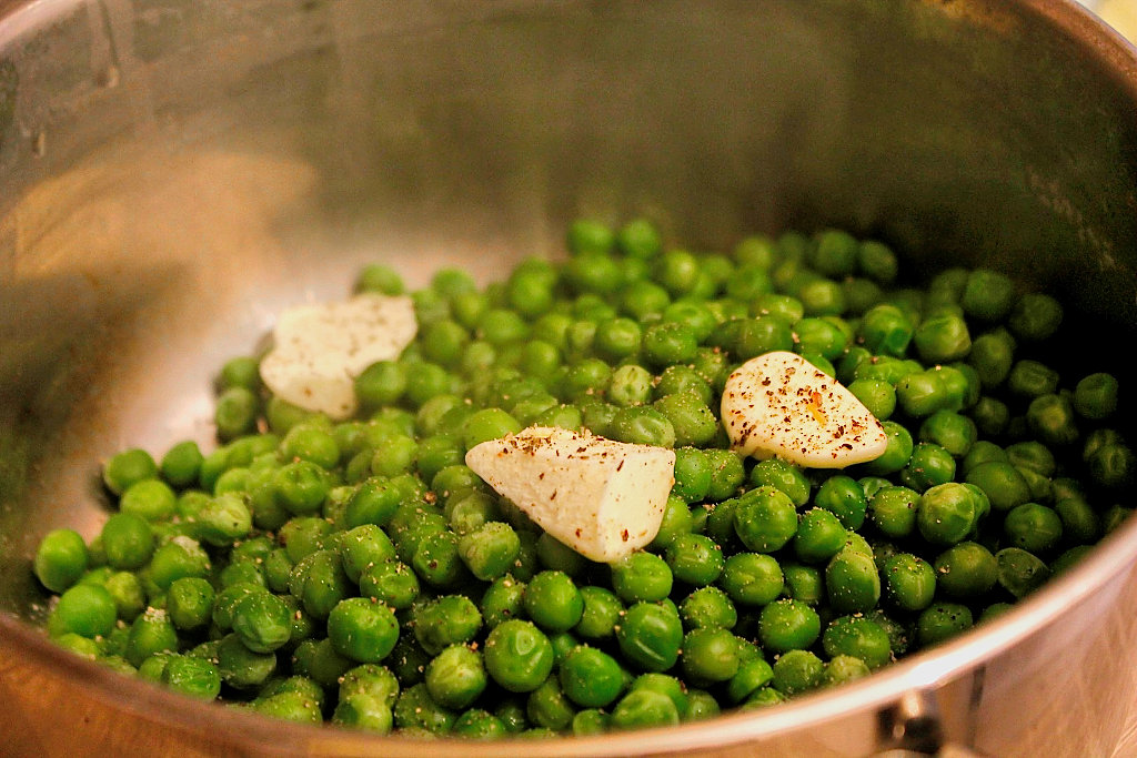 VI. Intr-o oala se pune mazarea impreuna cu untul si un praf de sare si putin piper proaspat macinat.