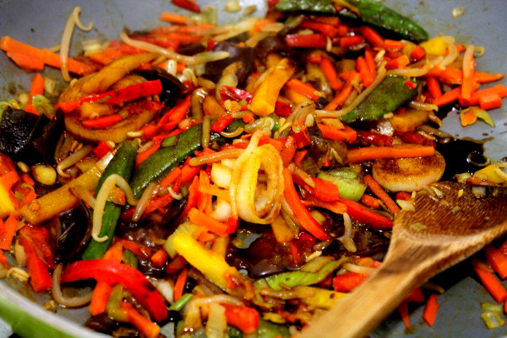 Mai tineti legumele pe foc incat 3-4 minute apoi stingeti focul. Servici ciocanelele cu legumele in sos de soia, simple eventual cu inca putin sos de soia langa.