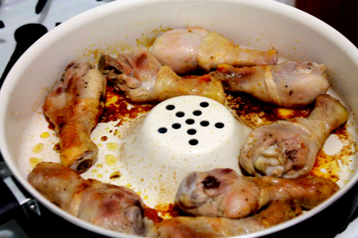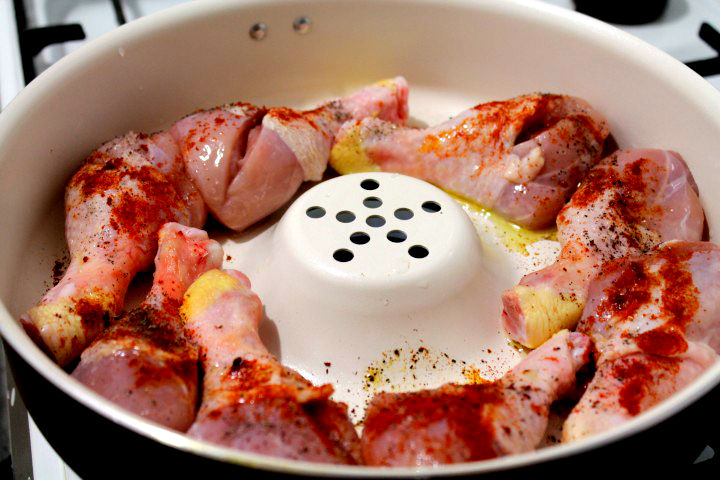 Se pun ciocanelele de pui in tigaie si se stropesc cu uleiul de masline. Condimentati dupa gust cu sare, piper, boia si chilli.