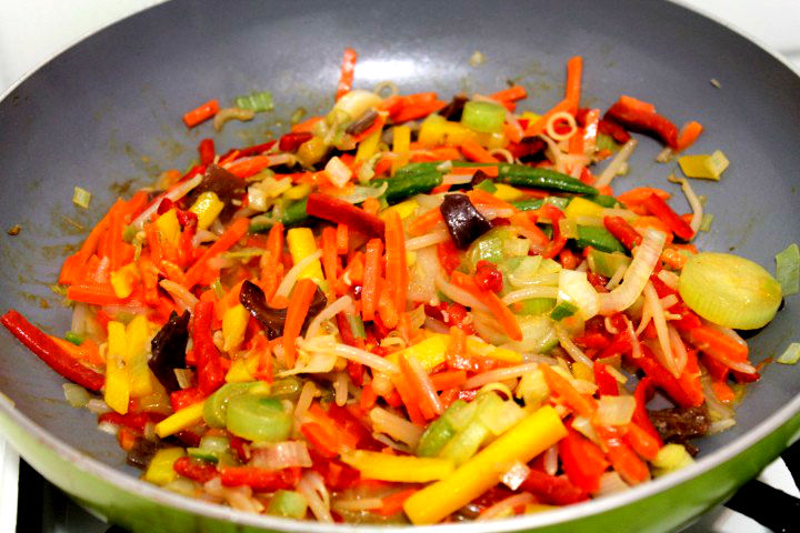 Intre timp intr-o alta tigaie puneti o lingura de ulei si caliti al dente legumele.