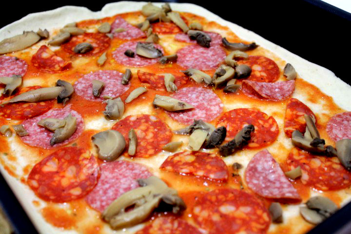 O regula de baza ar fi – sos de rosii prima data si mozzarela ultima data – in rest intre aceste doua ingrediente puteti sa puneti ce vreti voi, salam, sunca, ciuperci, ardei, masline, spanac, peste, pui, salata, etc. La condimente puteti sa folositi oregano, busuioc, cimbru, chilli, piper alb sau negru, pasta de ardei iute sau dulce, orice va trece prin cap.