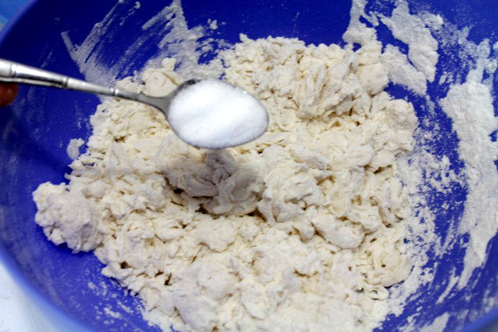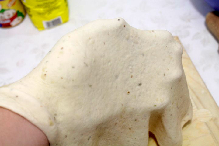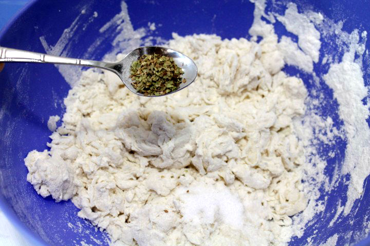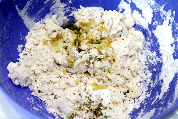 Intr-un castron mai mare puneti faina iar in mijloc faceti o gaura cu mana in care o sa turnati amestecul de drojdie, sarea, oregano si uleiul de masline