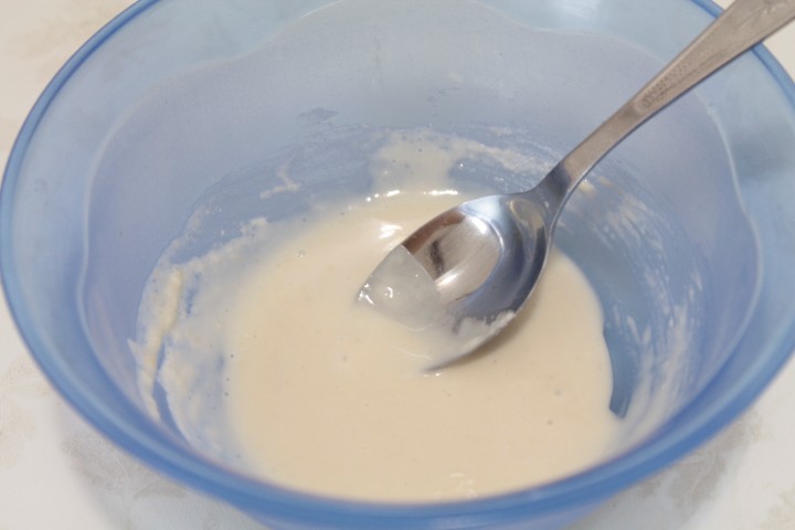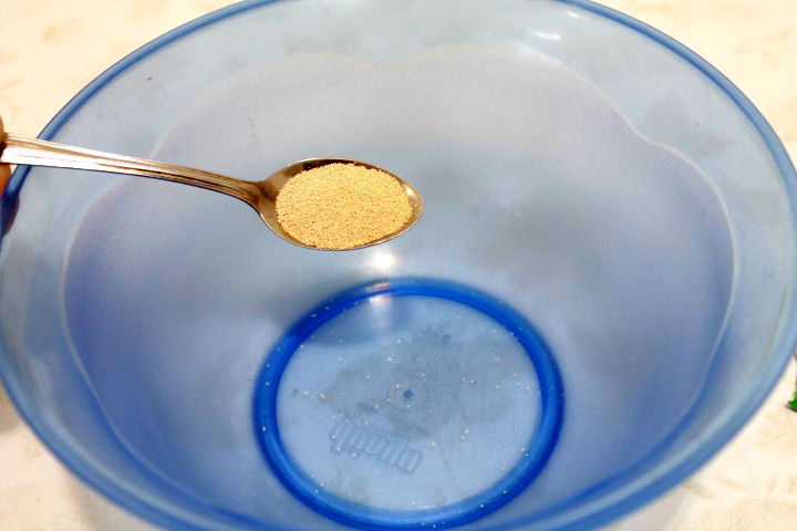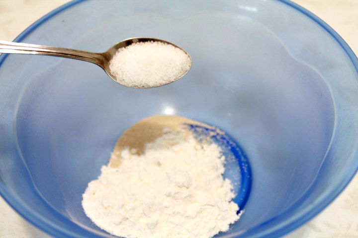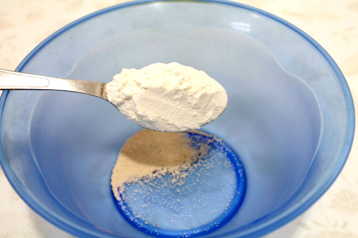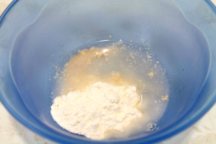 Intr-un castronel se pune drojdia, zaharul, 1 lingura de faina si 3-4 linguri de apa calda.