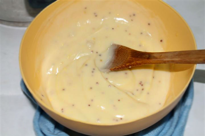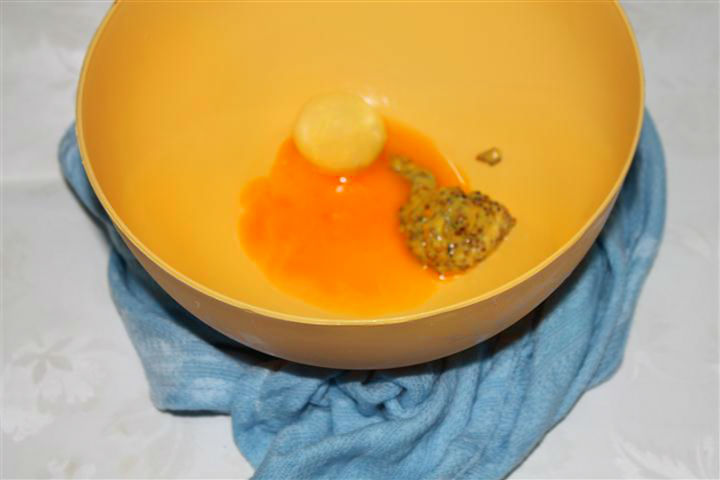 Fierbeti un ou tare. Intr-un bol amestecati galbenusul fiert si un galbenus crud impreuna cu lingurita de mustar.