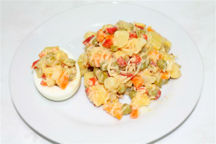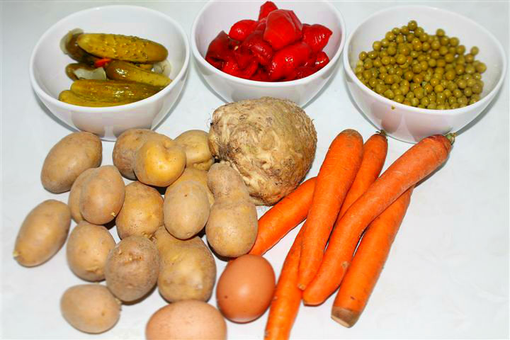 Salara mea este altfel.Fierb o oala mare cu morcovi si o oala mai mica cu cartofi.Arunca apa dupa ce stau putin.Reci ii tai bucati.Adaug castraveti murati,fasole boabe din conserva spalata cu apa rece de 3 ori.suc lamaie,sare 1 lingura.Fac maioneza cu oua fierte.2 galbenusuri se freaca cu suc lamaie,jumatate borcan mustar si ulei ,putin cate putin.nu prea mult ulei.Se amesteca maioneza cu zarzavaturile.se pune in cutii la frigider.