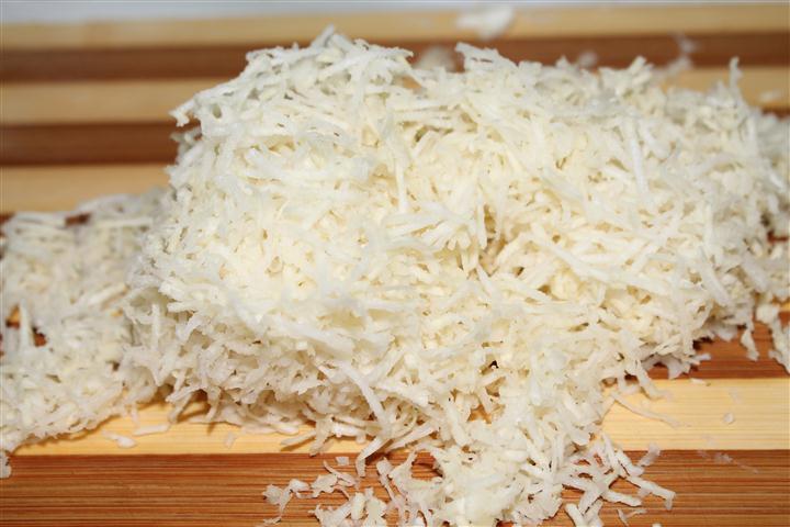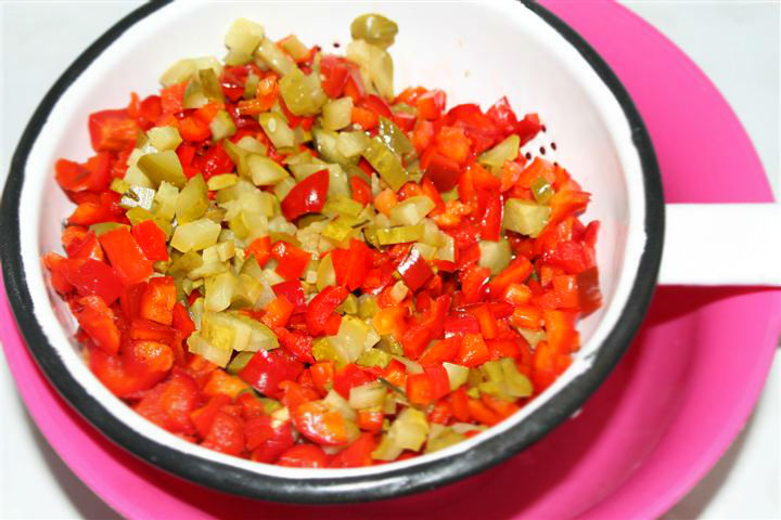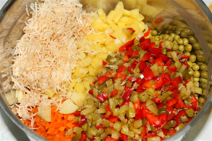 Dupa ce s-au fiert morcovii si cartofii adugati peste ei apa rece sa se raceasca si apoi curatati-i de coaja si toacati-i cubulete.