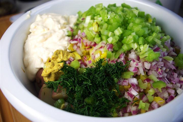 Intr-un bol amestecati, cartofii impreuna cu telina, ceapa, oualele, castraveciorii, maioneza, mustarul si mararul tocat marunt si amestecati cu usurinta.