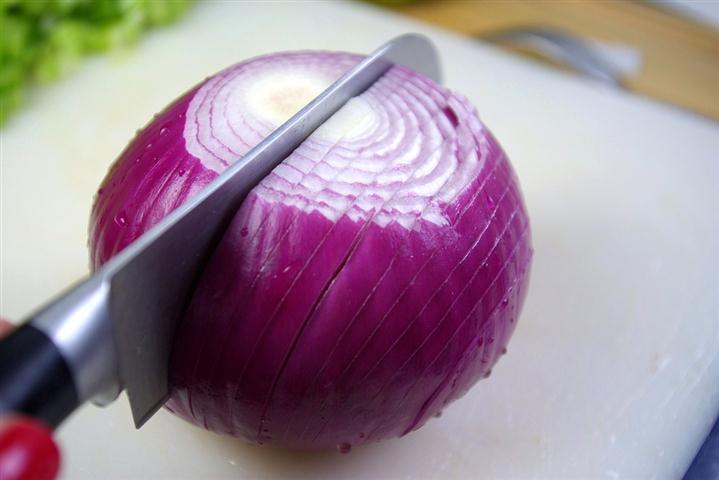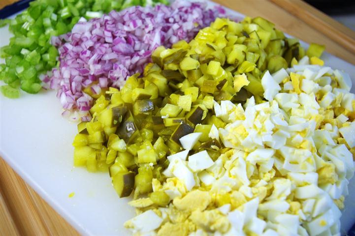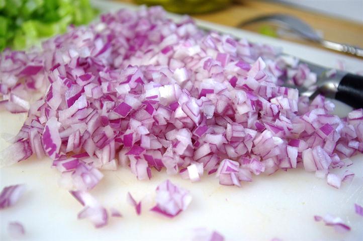 Ceapa, telina, oualele(reci) si castraveciorii se toaca marunt (cubulete).