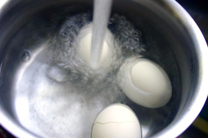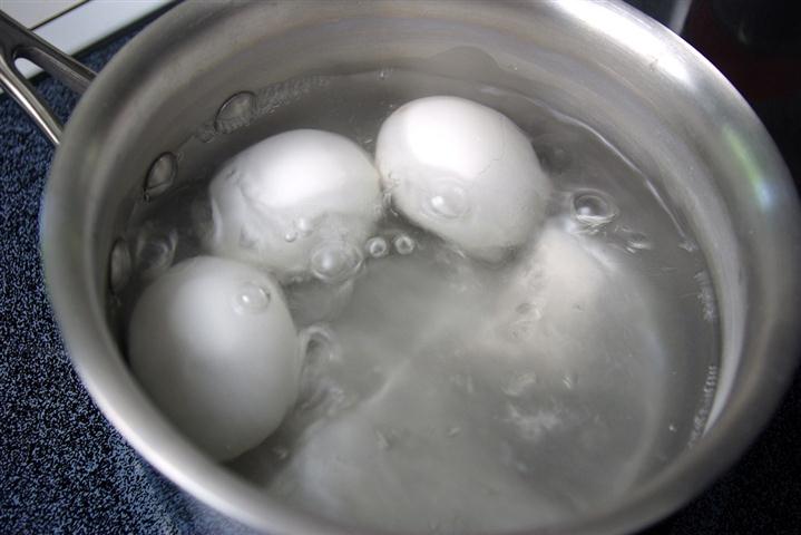 Oualele se pun la fiert si se tin pe foc vreo 5-7 minute, sa se fiarba tare, dupa care se pun sub jet de apa rece sa se poata decoji cu usurinta.
