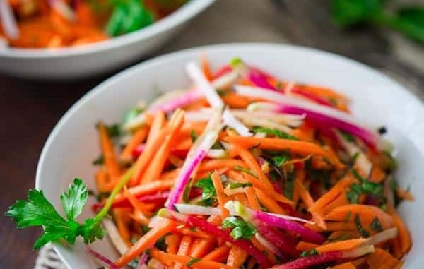- Se curata marul si se da prin razatoarea mare sau se taie in felii subtiri si apoi in fasii. Apoi, se amesteca cu prazul si uleiul.
