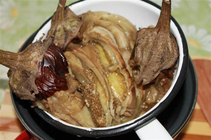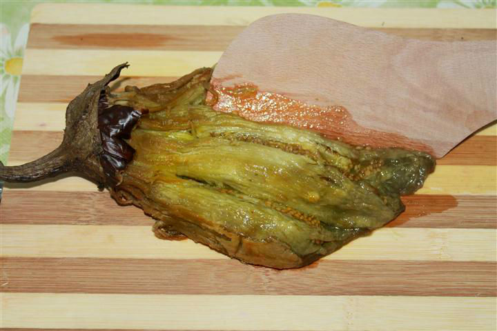 Se curata de coaja tinand de cotor si curatand cu mana. Nu folositi obiecte din metal ! Se sectioneaza pulpa vinetei cu un cutit de lemn/ceramica pentru a se scurge mai bine.