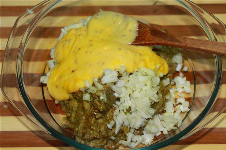 Intr-un castron mai mare adaugati vinetele tocate, o parte din maioneza, ceapa tocata marunt si amestecati usor pana se omogenizeaza.