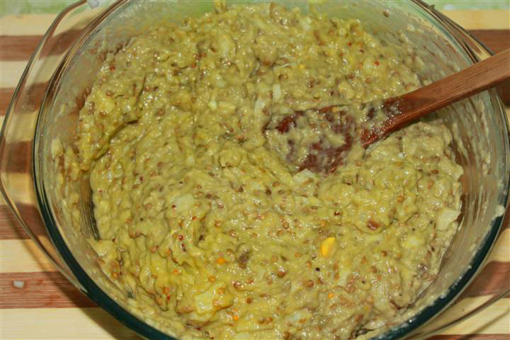 Cat timp se scurg vinetele va puteti apuca de maioneza. Se amestca 1 galbenus tare impreuna cu un galbenus moale si o lingurita de mustar.