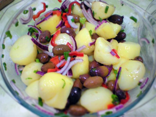 Intr-un vas cu capac se pun cartofi cand sunt aproape reci, se adaugaa legumele tocate si maslinele.