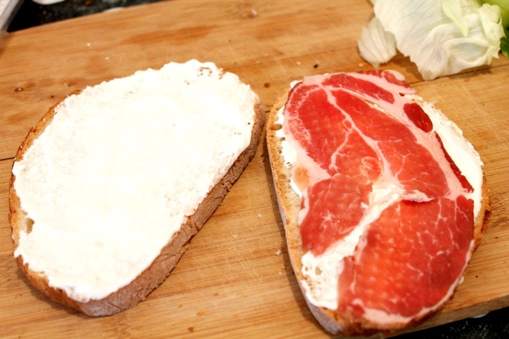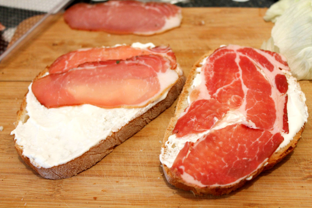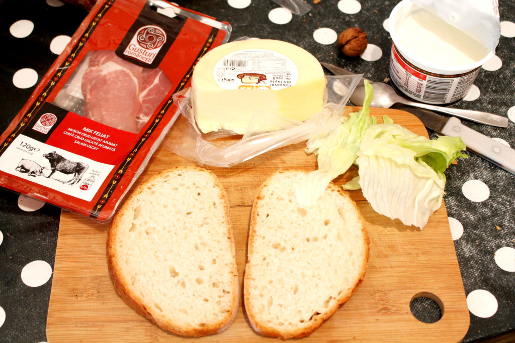I. Feliile de paine se ung bine cu crema de branza dulce. pe una din ele se pune muschi crud uscat iar pe cealalta se pune ceafa crud uscata.