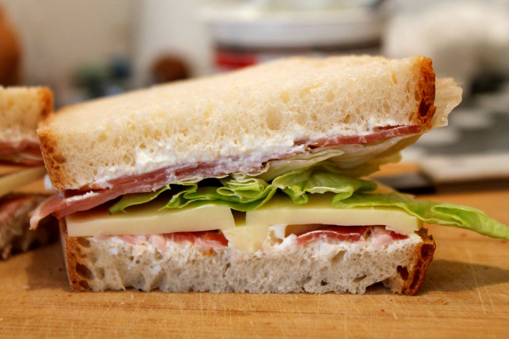 II. Se pune apoi cascavalul pe o felie iar pe cealalta felie se pune salata iceberg. Apoi se undesc feliile si se preseaza bine.