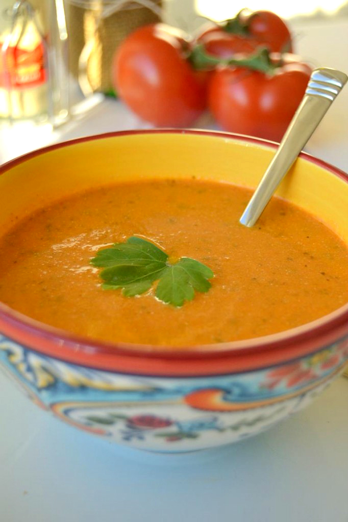 Pentru ca incep pe piata sa apara rosiile proaspete din Romania m-a trecut o pofta de supa de rosii. De obicei mai fac cu taietei sau cateodata cu rosiile coapte, de data asta am incercat cu ele curatate de coaja si decat calite in ulei cu condimente. Rezultatul a fost exceptional, va recomand cu caldura sa incercati. Se serveste cu smantana, crutoane de paine si patrunjel proaspat.