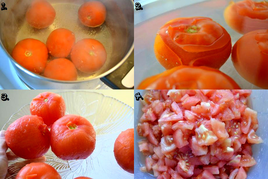 I. Se umple o oala mare cu apa si se lasa la fiert. Se adauga rosiile in apa fiarta, timp de 1-2 minute pana incep sa se decojeasca. Se scot rosiile din apa fierbinte si se pun in apa rece. Dupa ce se racesc se decojesc si se taie in cubulete.