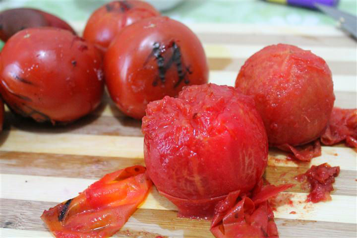 Dupa ce s-au copt bine pe toate partile, rosiile se iau de pe foc si se pun putin la racit. Apoi se decojesc, se taie in doua si se scoate mijlocul care este tare si verde de obicei.